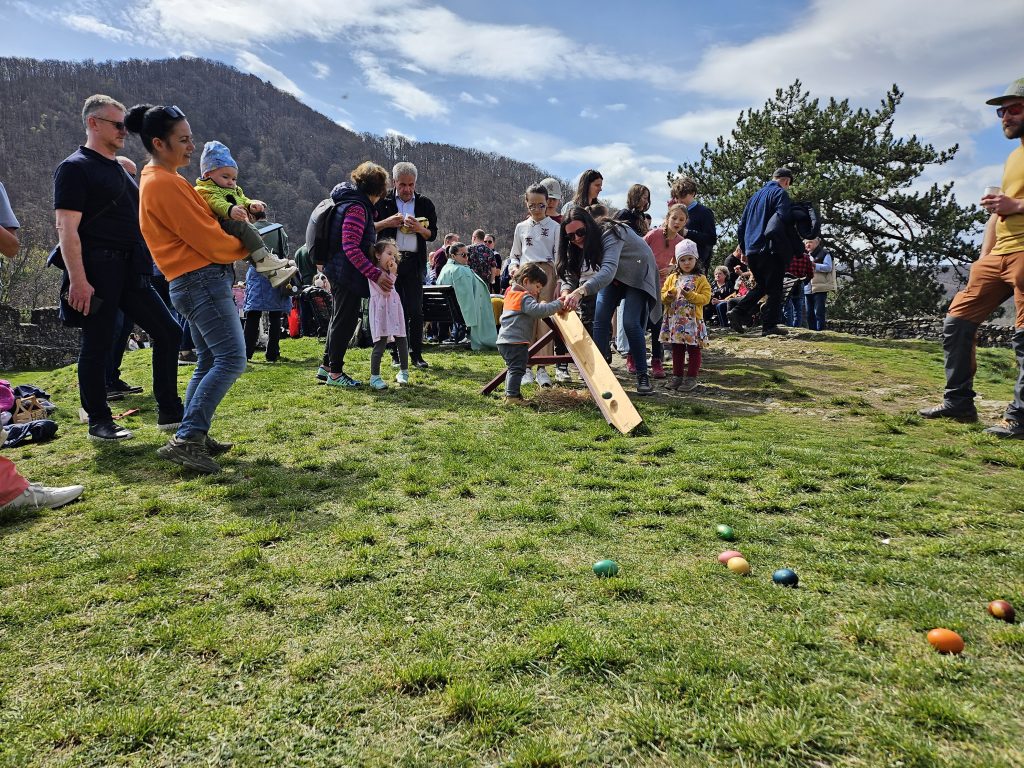 Das Eierschippeln auf der Michelsberger Burg gehört am Ostermontag nicht nur für die evangelische Kirchengemeinde zu einem festen Termin im Jahr. Nach der Andacht in der romanischen Basilika, gehalten von den Pfarrern László Zorán Kézdi und Stefan Cosoroabă, machten alle begeistert mit. Foto: Beatrice UNGAR