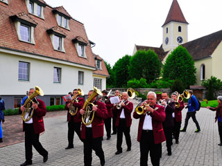 Foto 1: Zum Auftakt des erfolgreichen Maiblasens spielten die Probstdorfer Adjuvanten vor der Kulisse der Kirchenburg auf.