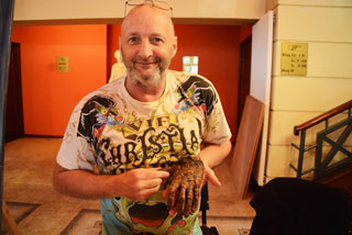 Foto 2: William Robinson präsentiert das älteste Exponat aus seiner Sonderausstellung: die Replik einer mumifizierten Hand aus Ägypten von 4.000 v. Chr., auf der ein Tattoo deutlich zu sehen ist.