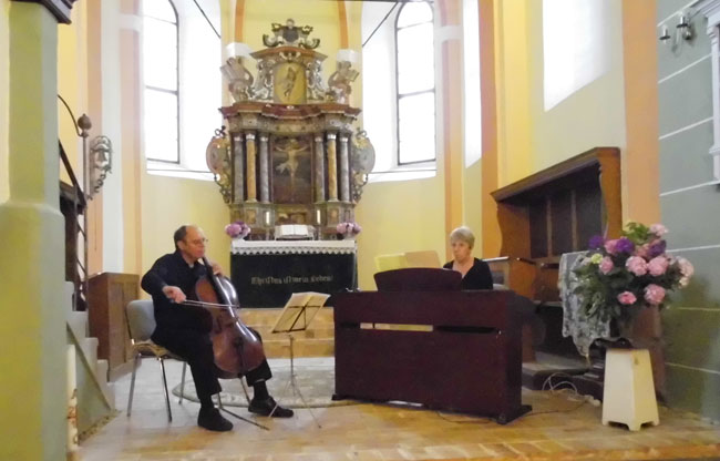 Trotz Regenschauer, Blitz und Donner war das Konzert sehr gut besucht. Kurt Philippi vertrat mit seinem Cello die Viola da Gamba-Familie mit den feinsten Bassnoten des ausgewählten Repertoires, während Ursula Philippi die evangelische Kirche unten im Dorf, mit Klavier- und Orgeltönen belebte.