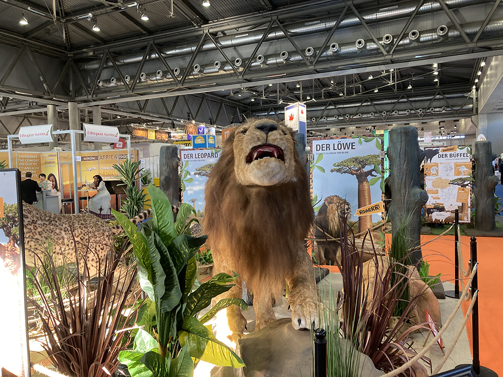 Drei der ,,Africa’s Big 5″, die als Riesenplüschtiere bei den Ferienmesse-Besucherinnen und -Besuchern Safari-Feeling aufkommen ließen: Löwe, Leopard und Spitzmaulnashorn bzw. Breitmaulnashorn. Fotos: Ingrid WEISS