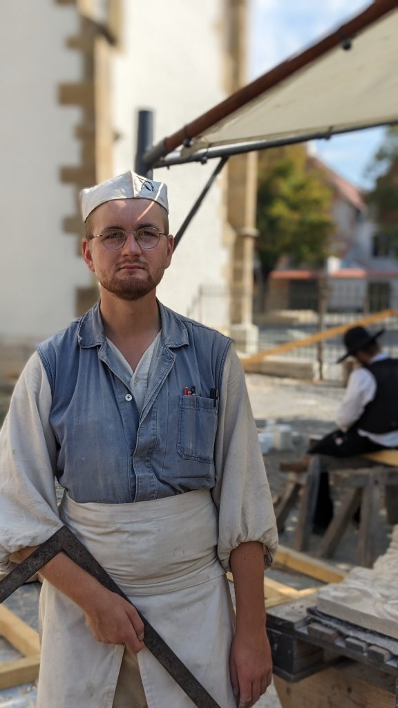 An einer dieser Schauwerkstätten arbeitet Tobias Wright. Er ist einer der letzten Wandergesellen aus Großbritannien und einer der Ersten seit einer ganzen Weile. Als Steinmetz kann er auf ein gewisses Fundament bauen, denn sein Meister ging in den 70ern selbst auf Wanderschaft und erzählte ihm viel darüber. Tobias erklärt, dass es in Großbritannien früher eine ähnlich ausgeprägte Handwerkskultur mit Wanderschaft gab wie in Deutschland. „Durch die Industrialisierung und danach öffneten sich viele Betriebe für Investoren. Und diese wollten lieber ihre Dividende ausgeschüttet bekommen als in die Ausbildung neuer Lehrlinge zu investieren.“