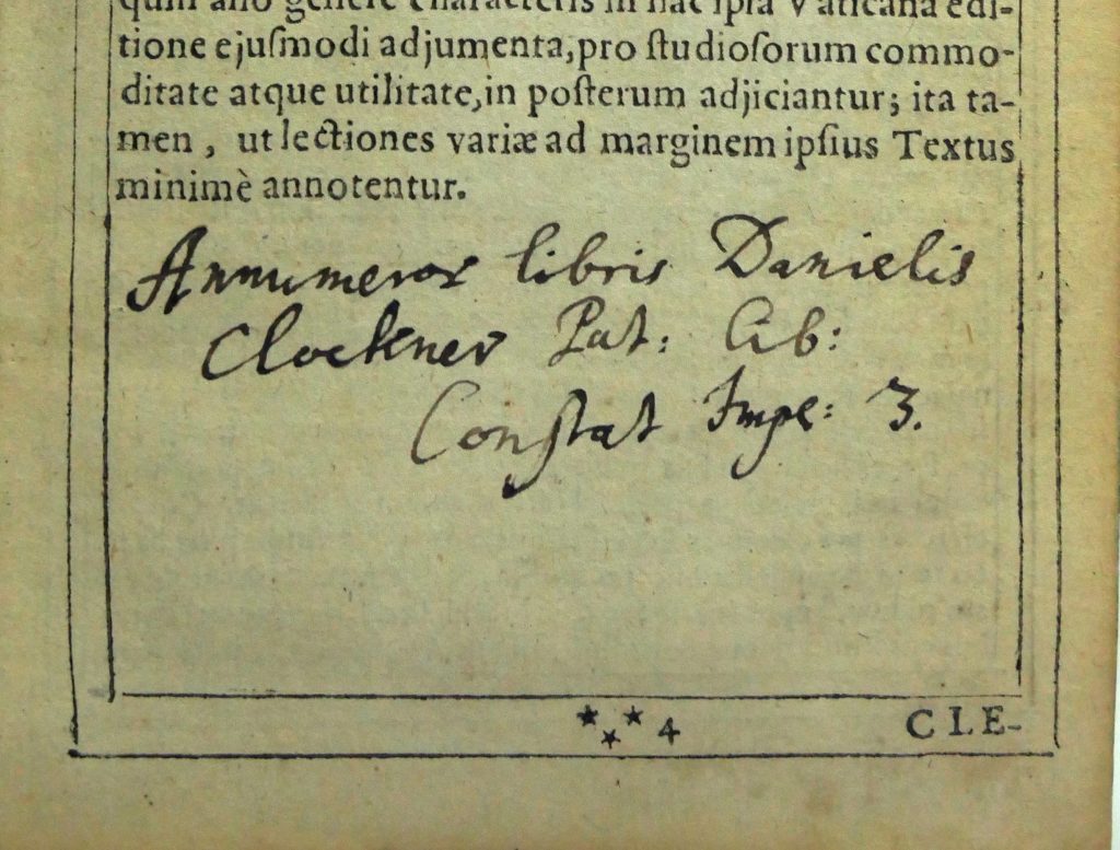 Irgendwann in der ersten Hälfte des 18. Jahrhunderts, möglicherweise für die Summe von 3 Gulden, gelangte diese Bibel in den Besitz von Sophies Vater, wie er selbst durch die Inschrift, die er am Anfang des Exemplars hinterließ, berichtet: „Annumeror libris Danielis Clockner Pat: Cib: Constat Impe: 3.” d. h. „ich füge dieses Buch (in meiner Sammlung) Daniel Clockner, Patrizier aus Hermannstadt, hinzu”. Ich kann nicht mit Sicherheit sagen, dass sich die Ziffer „3” auf den Preis des Buches bezieht, aber wenn wir uns ansehen, wie viel eine ähnliche Bibel damals auf dem Buchmarkt gekostet hat, ist es keineswegs ausgeschlossen, dass dieses „3” den Preis der Ausgabe in Gulden angibt. Zum Beispiel wurde 1776 in Wien eine Biblia Latina Sixti V. Clemens VIII., 1675 in Lyon gedruckt, in-8° – also ähnlich wie Brukenthals Ausgabe – ebenfalls 3 Gulden.