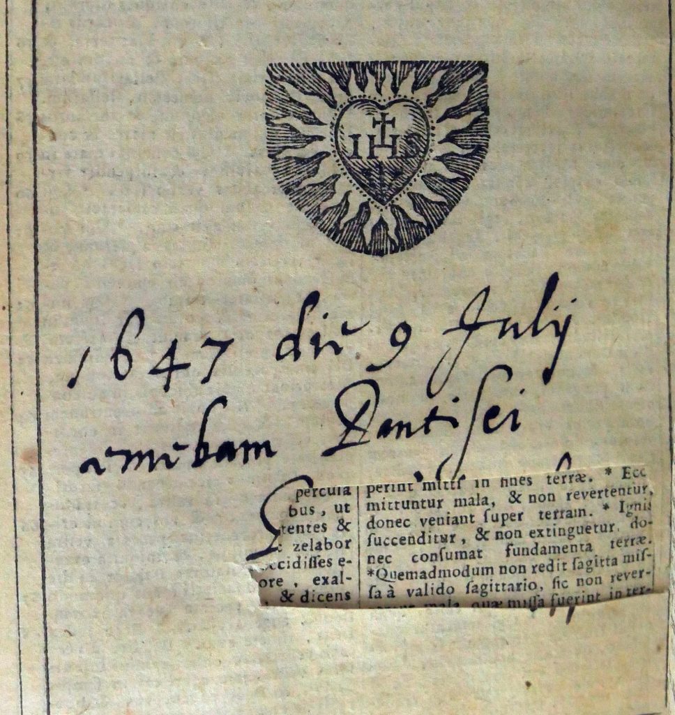 Eintrag am Ende der Kölner Vulgata von 1638, aus der hervorgeht, dass sich der Band im Sommer 1647 in Gdańsk (Danzig/Dantisci) befand. Leider ist die Stelle, an der wahrscheinlich der Name der Person, die den Eintrag geschrieben hat, stand, herausgeschnitten worden.