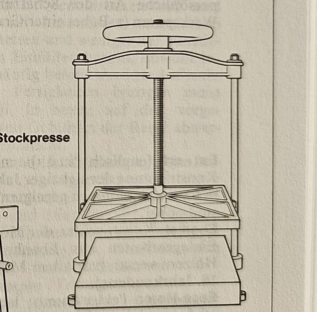 Einfache Stockpresse, vorwiegend für die Herstellung von Einblattdrucken. Mühselig können aber auch in kleinster Auflage Bücher gedruckt werden.