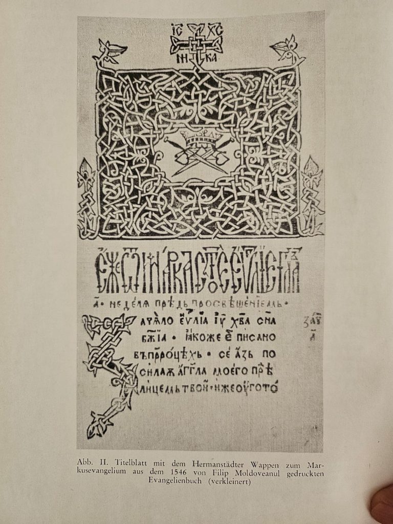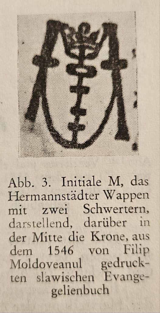 Aus dem 1546 von Filip Moldoveanul gedruckten slawischen Evangelienbuch: Initiale „M” mit zwei Schwertern und darüber die Krone – dem Hermannstädter Wappen entnommen, in eigenwilliger Form aber das Wappen selbst darstellend.
