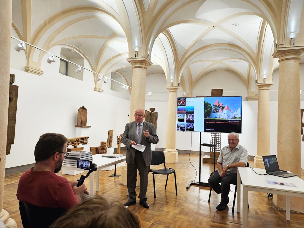 Der Bildband „Das Harbachtal, das Kaltbachtal und der Krautwinkel“ setzt die Reihe der Bände „Siebenbürgen im Flug“, „Das Burzenland“, „Hermannstadt und das Alte Land“, „Einblick ins Zwischenkokelgebiet“, „Schäßburg und die Große Kokel“ und „Mediasch und das siebenbürgische Weinland“ fort und lädt zu einer Reise durch das Harbachtal, das Kaltbachtal und den Krautwinkel ein. Wie die genannten Bildbände enthält auch dieser Bilder von Georg Gerster, dem Schweizer Flugbildfotografen und von Martin Rill, dem Verfasser und Herausgeber. Am 12. August hat Rill auf Einladung von Raluca Teodorescu, der Leiterin ad interim des Brukenthalmuseums, den Band im ehemaligen Landkartenkabinett vorgestellt. Bild oben: Martin Rill überreichte zwei anwesenden Bürgermeistern je einen Bildband; Bild unten: Dr. Rudolf Gräf (stehend), der Leiter des Forschungsinstituts der Rumänischen Akademie in Hermannstadt, stellte den Bildband in bewährter kurzweiliger und kenntnisreicher Weise vor. Fotos: Beatrice UNGAR