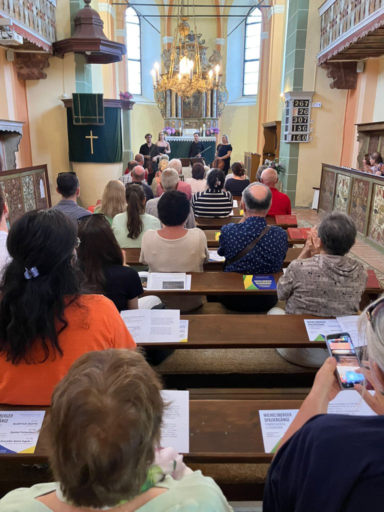 Der 6. Sonntag nach Trinitatis war damit natürlich noch nicht zu Ende. Nach dem Gottesdienst hat es bei Kaffee und Kuchen noch sehr lebendige Gespräche gegeben, die meist mit der Frage endeten: Kommst Du heute zu den – zum wiederholten Mal stattfindenden – „Michelsberger Spaziergängen“? Eine ansprechende Konzertreihe, die an diesem Sonntag mit dem „Quadrivium Quartett“ aus Klausenburg stattfinden sollte. Die Frage, ob man wohl dabei ist, konnte nicht durchgehend mit JA beantwortet werden, hatte der Silberbach doch kleinere Spuren hier und da hinterlassen, die es zu beseitigen galt. Das hat aber dem Sonntagnachmittagskonzert keinen Abbruch getan, denn die Gäste sind nicht nur aus Michelsberg gekommen, sondern eben auch aus der näheren Umgebung. Als Liebhaber dieser sinnlichen Sonntagnachmittags-Veranstaltung konnte man sehen, dass viele Besucher (Klassikliebhaber) schon seit Jahren die anspruchsvolle Veranstaltung in der atmosphärischen Kirche in Michelsberg mit ihrem Besuch beehren. Das Konzert – es erklangen Werke von Felix Mendelssohn-Bartholdy und Ludwig van Beethoven – hat gehalten, was man sich davon versprochen hat und in der sehr gut besetzten Kirche konnte man rundum in zufriedene Gesichter blicken. Die Gemeinde Michelsberg hat es sich nicht nehmen lassen, wie auch nach dem Gottesdienst am Vormittag, die Anwesenden zu einer Tasse Kaffee, diesmal mit köstlichem Hanklich, einzuladen und die Gäste machten reichlich Gebrauch davon. Trotz leichtem Nieselregen verweilte man im Gemeindesaal – leider nicht im Pfarrgarten – und erzählte sich einige Anekdoten. Man konnte sehen und spüren, dass Gott seine Menschen und seine Welt liebt. Es sind die nicht immer sichtbaren Hände der Vielen in Michelsberg, die selbst ein so dramatisch daherkommendes Wochenende mit seinen Wetterunbilden am Samstag, fühlen lassen, dass Gott gegenwärtig und lebendig ist und den Mensch mit Optimismus und Vertrauen an das Gute weiter gehen lässt. Der nächste „Michelsberger Spaziergang“ findet am 3. August, dem 7. Sonntag nach Trinitatis, 17 Uhr in der Michelsberger evangelischen Kirche statt.