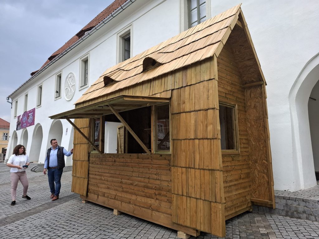 Der vom Kreisrat und dem ASTRA-Museum veranstaltete Ökotourismus-Markt findet in diesem Jahr vom 22. bis 28. September auf dem Kleinen Ring statt. Dafür werden derzeit im ASTRA-Museum Spezialhäuschen angefertigt. Unser Bild: Der stellvertretende Kreisratsvorsitzende Paul Kuttesch und die Leiterin der Abteilung Marketing und Bildung des ASTRA-Museums Ioana Dan begutachten den ersten Prototyp des Häuschens vor dem Schatzkästlein am Kleinen Ring.