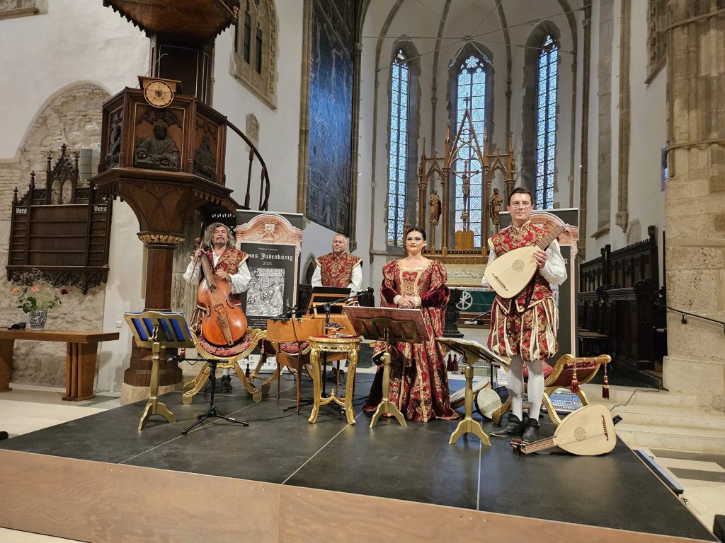 „Ain schone künstliche Underweisung in disem Büechlein, leychtlich zu begreyffen den rechten Grund zu lernen auff der Lautten und Geygen” lautet der Titel der 1523 bei Hans Singryener in Wien gedruckten Sammlung, welche sich jetzt im Nationalarchiv Kronstadt befindet. Autor der Sammlung ist der deutsche Musiker und Lautenspieler Hans Judenkünig (1450-1526), einer der bedeutendsten Instrumentalisten der Renaissance. Mit Werken aus dieser Sammlung begaben sich die Instrumentalisten Narcisa Brumar (Sopran), Caius Hera (Laute), Erich Türk (Spinett), Szabó Zsolt (Viola da gamba) auf die „Hans Judenkünig-Landestournee”, die mit einem Konzert in der Klosterkirche in Schäßburg am 22. Juli begann und heute, Freitag, den 1. August, mit einem Konzert im Barockpalais in Temeswar zu Ende geht.