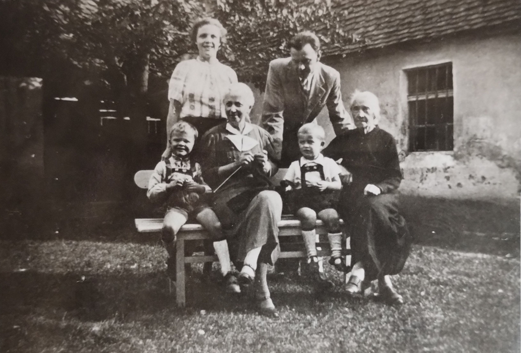 Zu Besuch bei den Goldschmidt-Großtanten in Freck: Hinter der Bank die Eltern Gertrud und Felix Schlattner und auf der Bank (v. l. n. r.) Eginald Schlattner, Adele Goldschmidt, Kurtfelix Schlattner und Johanna Goldschmidt. Foto: privat