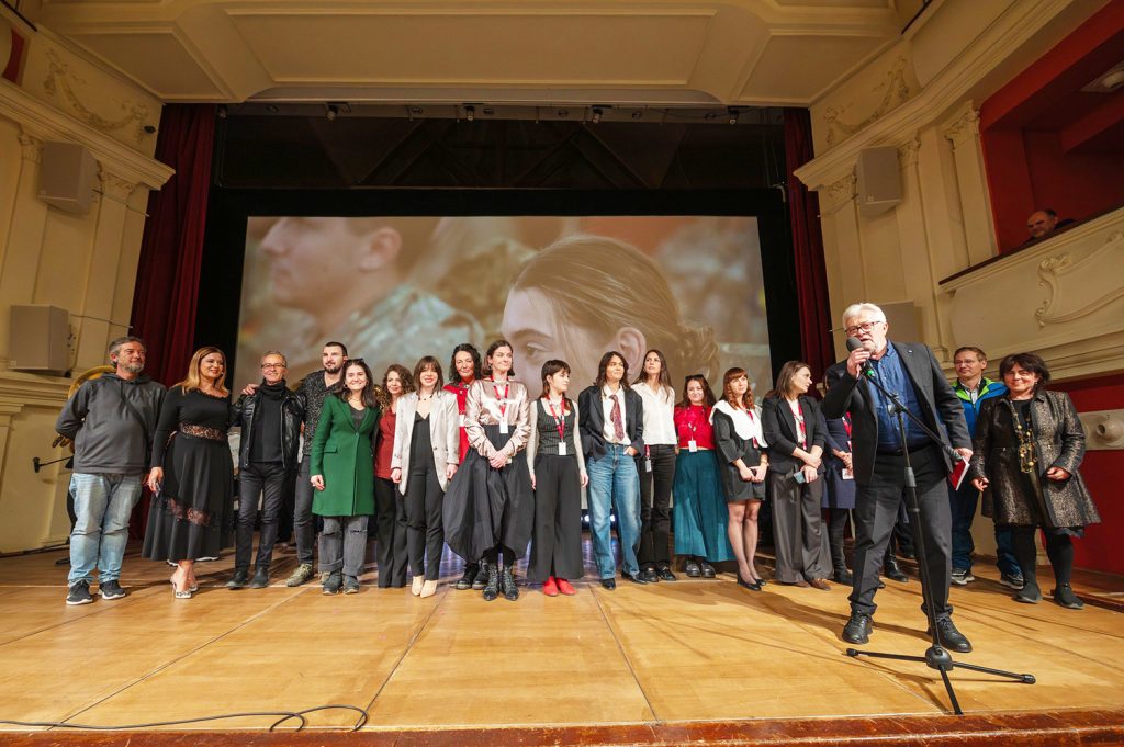 Festivalsdirektor Dumitru Budrala (vorne, am Mikrofon) präsentiert zum Abschluss der Preisgala, die am Samstag im Thaliasaal stattgefunden hat, sein 19-köpfiges Team, zu dem auch seine Gattin Csilla Kató (rechts außen) gehört. Foto: AFF
