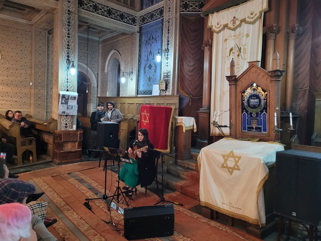 Jazz für die Seele boten Mădălina Petre (sitzend mit Gitarre) und Alexandru Pribeagu (im Hintergrund) in der bis auf den letzten Platz besetzten Synagoge. Foto: Eduard RESCHKE