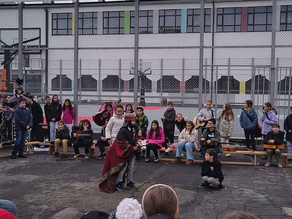 In Hermannstadt stellten auf dem Hof der „Onisifor Ghibu“-Schule Schülerinnen und Schüler der 4. Klasse berühmte Szenen nach, wie z. B. der römische Soldat Martin seinen Mantel mit einem frierenden Bettler teilt.