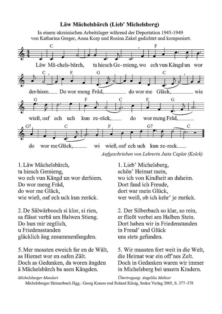 In einem ukrainischen Arbeitslager entstand eines der wenigen Lagerlieder in Mundart. Die drei Michelsberger Frauen und Mütter Katharina Greger, Anna Korp und Rosina Zakel haben Text und Melodie geschaffen und durch das Singen sicher Trost, Mut und Kraft geschöpft, diese schrecklichen Jahre zu überstehen und die innere Verbindung zur Heimat aufrechtzuerhalten.