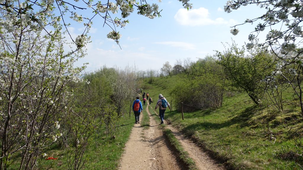 Bei leicht windigem Wetter und wolkenbedecktem Himmel starteten Samstagmorgen die 28 Teilnehmenden des Wandertags der Frauenarbeit vom Parkplatz des Elimheims, gespannt diesen Wanderweg auszukundschaften, denn keiner hatte ihn davor begangen. Manche waren von Weitem angereist, mit Autos, Zug und Bus. Weder frische Frühlingstemperaturen noch der starke Regen des Vortags hatte jemanden davon abhalten können. Letztendlich gibt es kein schlechtes Wetter, nur unpassende Kleidung und Schuhe. Ein Problem das keiner der Anwesenden hatte. Nach der ersten Anhöhe klärte sich der Himmel und bot viele Kodak-Momente. Cristian Cismaru führte geduldig und fachkundig durch die Gegend und bot viele, aufschlussreiche Informationen. Bei strahlender Sonne und blauem Himmel genossen alle Landschaft, Gemeinschaft und Austausch. Unser Wanderweg mündete beim Elimheim, wo ein warmes Mittagessen, schmackhafter Kuchen und Kaffee aufgetischt warteten und mitsamt thematischem Impuls und gemeinsamen Singen als krönender Abschluß verwöhnten. So gerne verweilten alle noch, dass sich Aufbruch und Abschied in den Nachnmittag hinaus verzögerten.