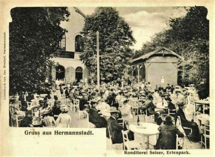 Bereits um die Mitte des 18. Jahrhunderts sind in Hermannstadt Kaffeehäuser nach Wiener Vorbild eröffnet worden. Aus einem Erlass des Hermannstädter Magistrats aus dem Jahre 1738 geht hervor, dass es zu jenem Zeitpunkt bereits mehrere Kaffeehäuser gab. Diese mussten infolge des Ausbruchs einer Pestepidemie ihre Tätigkeit einstellen. 1771 eröffnete der ehemalige Theaterdirektor, Livio Cinti, 1771 ein Café im Baron Möhringerschen Haus am Großen Ring 5 (heute Blaues Stadthaus) neben dem Brukenthalpalais. Schon 1776 wird erwähnt, dass die Konditore Anton Geist und Sebastian Wirth in Hermannstadt tätig sind. In der Sporergasse/General Magheru 2, 1933 hieß sie König Karlgasse, befand sich das Café und die Konditorei Seiser, deren Inhaber Oskar Seiser war. Dieser hatte Filialen in der Saggasse/Turnului 12 (heute befindet sich dort das Restaurant Akropolis) und von 1911 bis zur Enteignung 1948 im Erlenpark. Die Konditorei Seiser im Erlenpark (Bild oben) war nur in der Zeitspanne vom 1. Mai bis zum 15. Oktober geöffnet und bot ihren Gästen außer Konditoreierzeugnissen auch kalte Speisen, Wein und Bier an. Außerdem konzertierte hier wöchentlich die Militärkapelle.