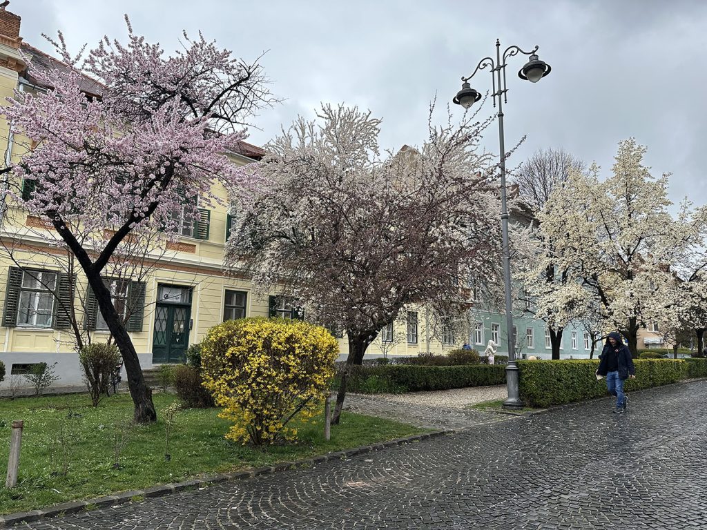 Farbenfroh trotz Regenwetter präsentierte sich der Schillerplatz in Hermannstadt seit Wochenbeginn. Die Magnolie und die Forsythia blühen und duften mit anderen Ziersträuchern um die Wette. An den nächsten beiden Oster-Wochenenden werden höhere Außentemperaturen und auch Sonnenschein erwartet. Foto: Cynthia PINTER